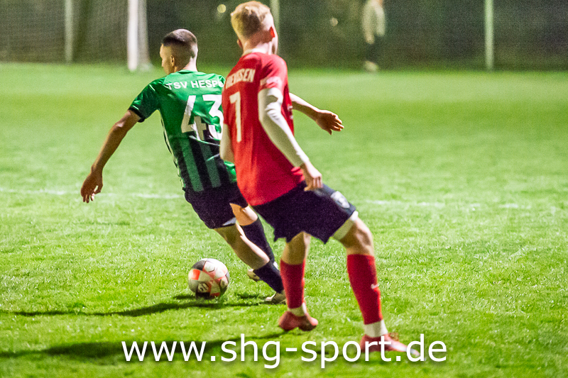 Vom Anpfiff weg zeigte Hevesen den absoluten Willen zum Sieg. Die Gastgeber standen hoch, rückten bis zur Mittellinie auf. Hespe ließ sich fallen, wollte den Gegner kommen lassen. Viel Entlastung vom Druck der Gastgeber brachte Hespe in der ersten Halbzeit nicht zustande, gerade im Mittelfeld wurden die Gäste sofort in Zweikämpfe verwickelt. „Es war klar, dass der, der den ersten Fehler macht verliert. Beide wollten, wir haben sie bewusst kommen lassen. Unter dem Strich haben sie verdient gewonnen, Glückwunsch an Hevesen“, sagte Aslan. Hevesen sei laufintensiver und griffiger gewesen. Der erste Fehler unterlief den Gästen, Mattes Wilharm traf kurz vor der Pause zum 1:0 (45.).