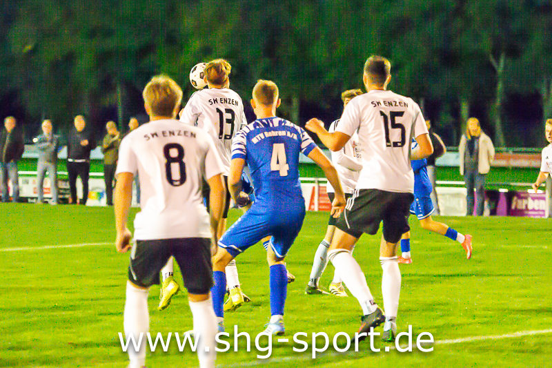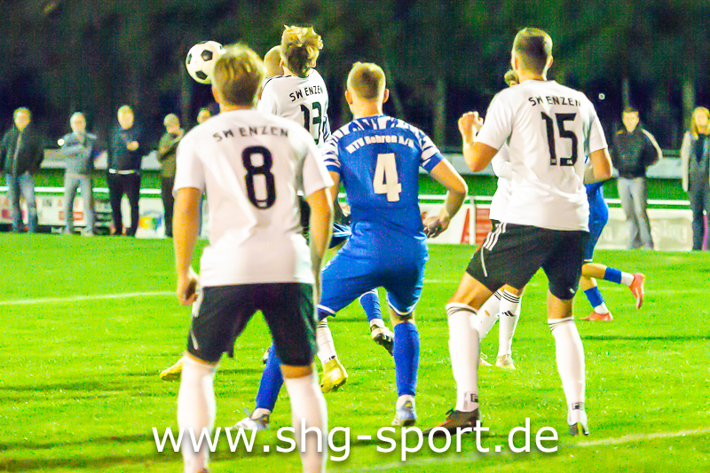 Enzen rückte sofort nach dem Anpfiff weit auf und lief schon nach wenigen Minuten ins offene Messer. Ein langer Schlag nach einem Ballverlust der Gastgeber im Mittelfeld erreichte Julian Meyer, der von der linken Seite mit einem Flachschuss ins lange Eck die frühe Rehrener 1:0-Führung erzielte (5.). In der Folge spielte sich das überwiegende Geschehen im Mittelfeld ab. Wäjhrend die Offensive der Gastgeber ohne jede Wirkung blieb, setzte Rehren über die Außenbahnen immer wieder zu Kontern an. Kurz vor der Pause wiederholten sich die Ereignisse, Enzen verlor den Ball, sofort folgte der lange Ball auf die linke Außenbahn. Wieder bekam Meyer den Ball, es folgte eine Kopie des ersten Tores. Ein gut platzierter Schuss von der linken Seite ins lange Eck, Rehren führte 2.0 (40.).