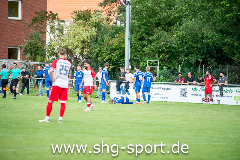 Evesen. Was für ein Pokalfight, da war alles drin: Tore, Tempo und Dramatik. Der VfR Evesen hat den MTV Rehren A/R mit einem 4:1 (4:0)-Sieg aus der 1. Runde des Bezirkspokals geworfen. Soweit das rein ergebnistechnische, die Dramatik zog sich durch das ganze Spiel. Der Rehrener Romek Oltrogge, gerade aus einer Verletzung gekommen, wurde mit Verdacht auf Kreuzbandriss ins Krankenhaus eingeliefert (35.). Nach rund 60 Minuten musste ein Rettungswagen zum zweiten Mal anrücken. Diesmal war der Gäste-Keeper Maxi Schmidbauer betroffen, der mit einem vermutlichen Armbruch in die Klinik musste. Beide Verletzungen zogen lange Unterbrechungen nach sich, so dass die Begegnung deutlich verspätet endete. Aber auch die Gastgeber hatten dramatische Momente.