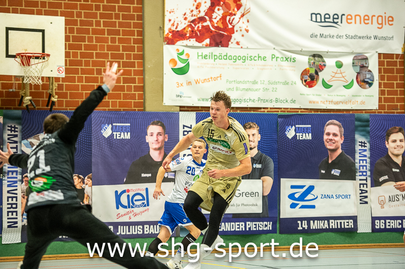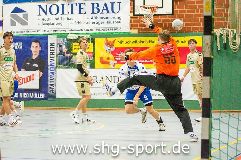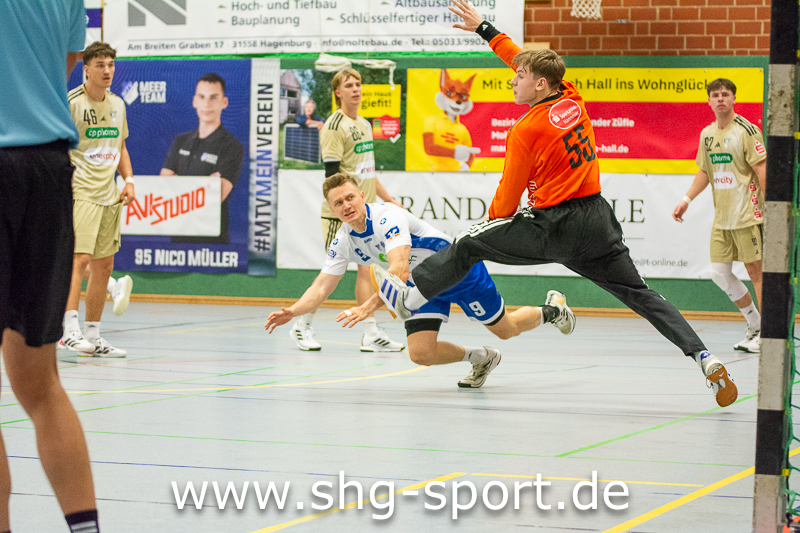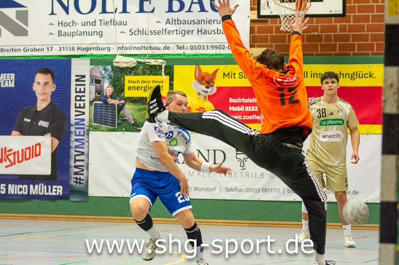 Wunstorf. In buchstäblich allerletzter Sekunde hat Maurice Nolte dem Regionalligisten MTV Großenheidorn im Spiel gegen die TSV Burgdorf II beim 34:34 (14:12) einen Punkt gerettet. Die Schlussminuten der Begegnung entschädigten für eine bis dahin wenig überzeugende Leistung der Seeprovinzler gegen eine starke Burgdorfer Mannschaft. In der 57. Minute lag der MTV 31:34 hinten, Julius Bausch und Jakob Bormann verkürzten auf 33:34 (58., 60.). Großenheidorn war in Ballbesitz, verlor den Ball, Burgdorf lief einen Tempogegenstoß, es blieben noch wenige Sekunden auf der Uhr. Jeder der 457 Zuschauer rechnete mit einer Entscheidung zu Gunsten der Gäste. Doch MTV-Keeper Felix Wernlein parierte den Wurf, warf den Ball nach vorn. Nolte fing ihn und warf sofort Richtung Tor, wo der Ball mit der Schlusssirene zum 34:34 einschlug.