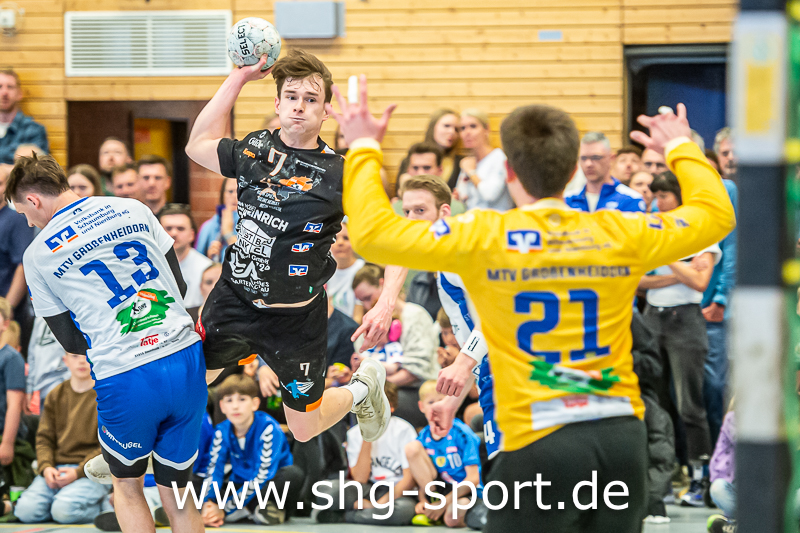 Die große Frage vor dem Derby war: Wie geht Großenheidorn mit dem Druck um, zeigen sie Nerven oder nicht? Es dauerte zwölf Minuten, dann nahm die HSG eine Auszeit, die Frage war klar beantwortet. 9:4 führte der MTV, die Gäste bekamen kaum ein Bein auf das Parkett, hatten mit dem erneut überragenden Julius Bausch als Antreiber massive Probleme. Dietrich stellte um, brachte den siebten Feldspieler. „Wir hatten gehofft, dass sie das spielen, sie können es nicht richtig, das war für uns super. Das es für uns nach vorne losgeht wussten wir, war schon im Hinspiel unser Gewinner. In der zweiten Halbzeit transportieren wir das durch“, so Lux.