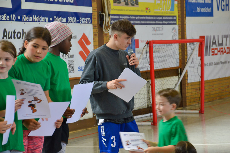 Die rund 70 Schülerinnen und Schüler der dritten und vierten Klassen von vier Wunstorfer Grundschulen konnten an fünf Stationen Stempel sammeln. Wer alle „Prüfungen“ absolviert hatte und zudem auch noch eine kniffelige Quizaufgabe beantworten konnte, bekam eine kleine Belohnung in Form eines GIW-Handball-AG-T-Shirts. Und natürlich spielten Dritt- und Viertklässler auch Handball. Weil aber das Erlebnis der der Spaß am Spiel im Vordergrund stand, wurde am Ende des Turniers kein Turniersieger zu prämiert. Alle Dritt- und Viertklässler bekamen eine Auszeichnung in Form einer persönlichen Urkunde.